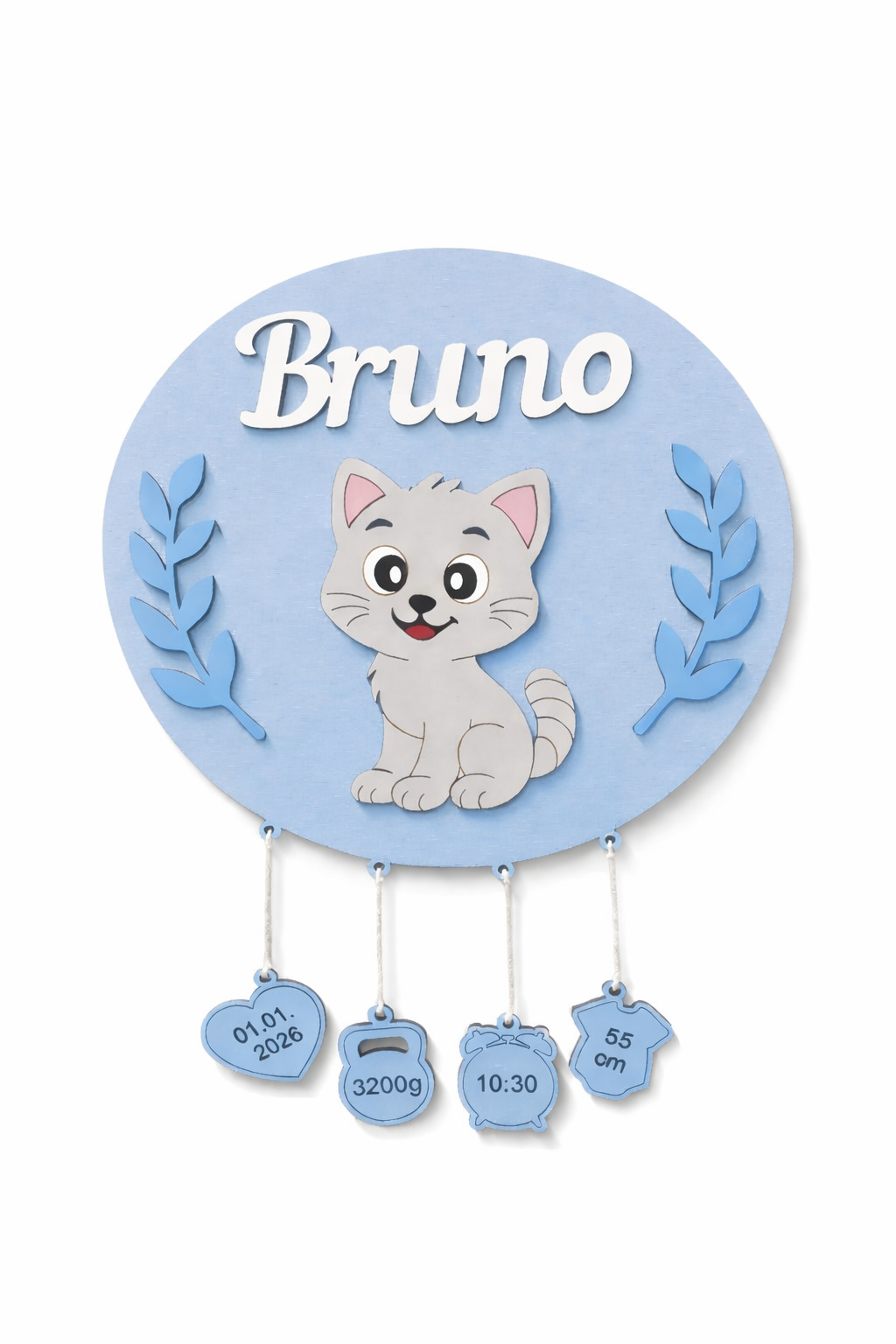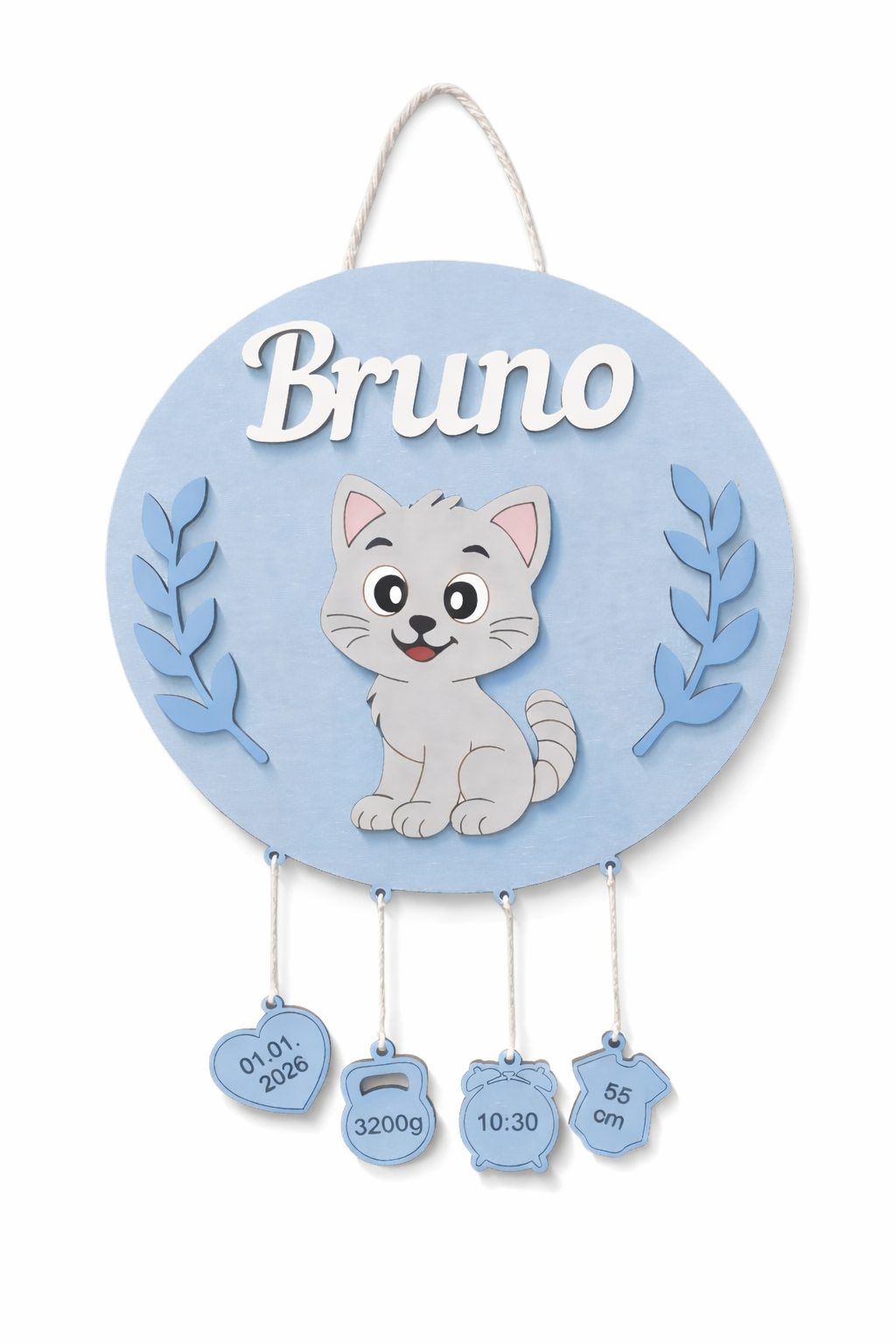 Urocza personalizowana dekoracja do pokoju dziecka z imieniem to wyjątkowy element wystroju, który nada wnętrzu ciepły, bajkowy charakter. Delikatna niebieska kompozycja z sympatycznym kotkiem sprawia, że ozdoba idealnie pasuje do pokoju chłopca.
