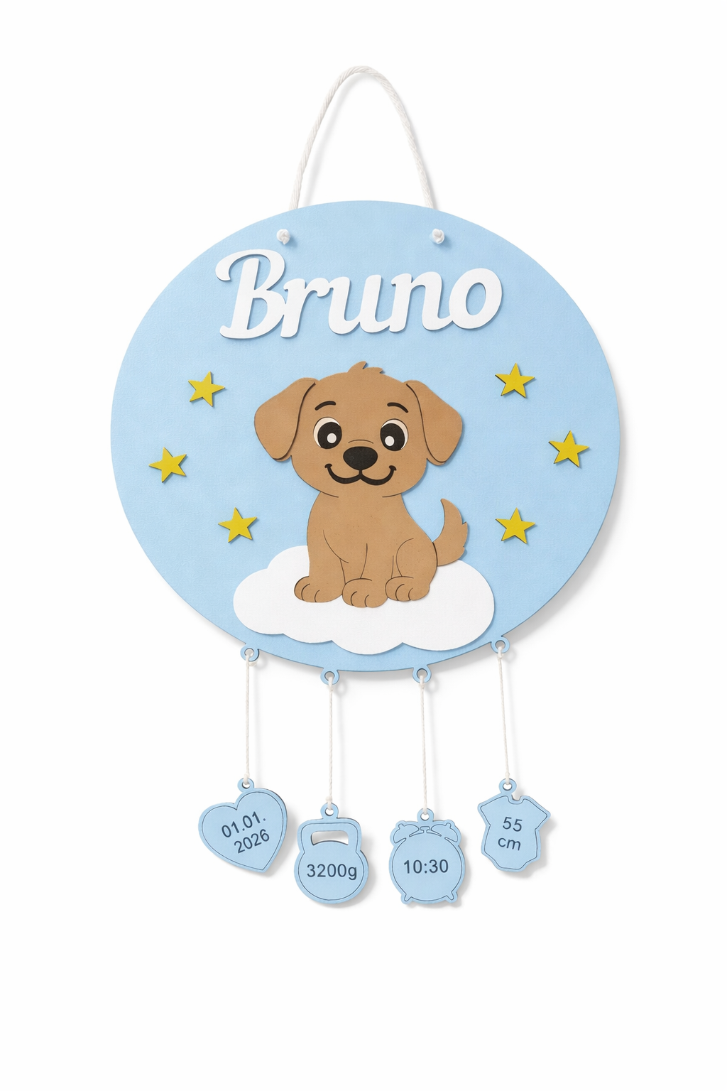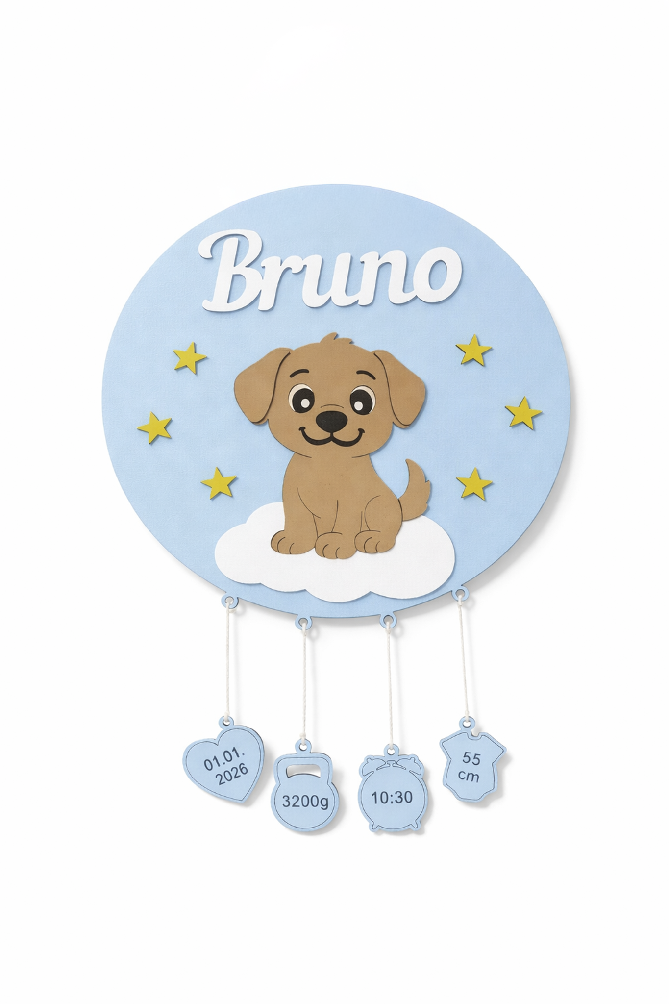 Urocza personalizowana dekoracja do pokoju dziecka z imieniem to wyjątkowy element wystroju, który nada wnętrzu ciepły, bajkowy charakter. Delikatna niebieska kompozycja z sympatycznym pieskiem sprawia, że ozdoba idealnie pasuje do pokoju chłopca.